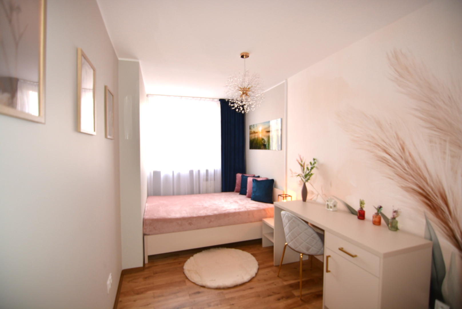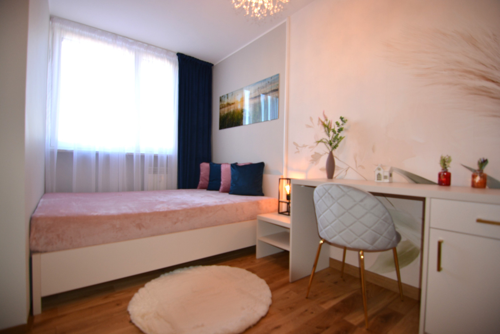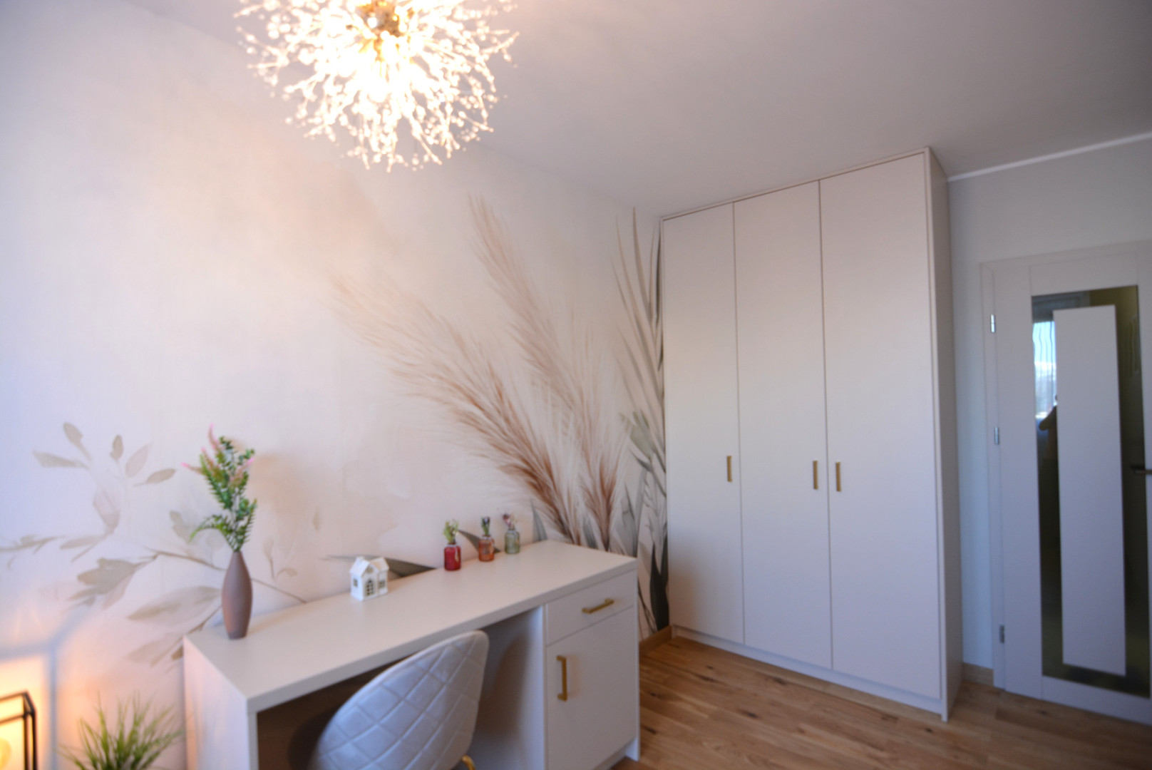 -sypialnia z łóżkiem z materacem, dużą szafą w zabudowie, stolikiem nocnym, biurkiem i krzesłem