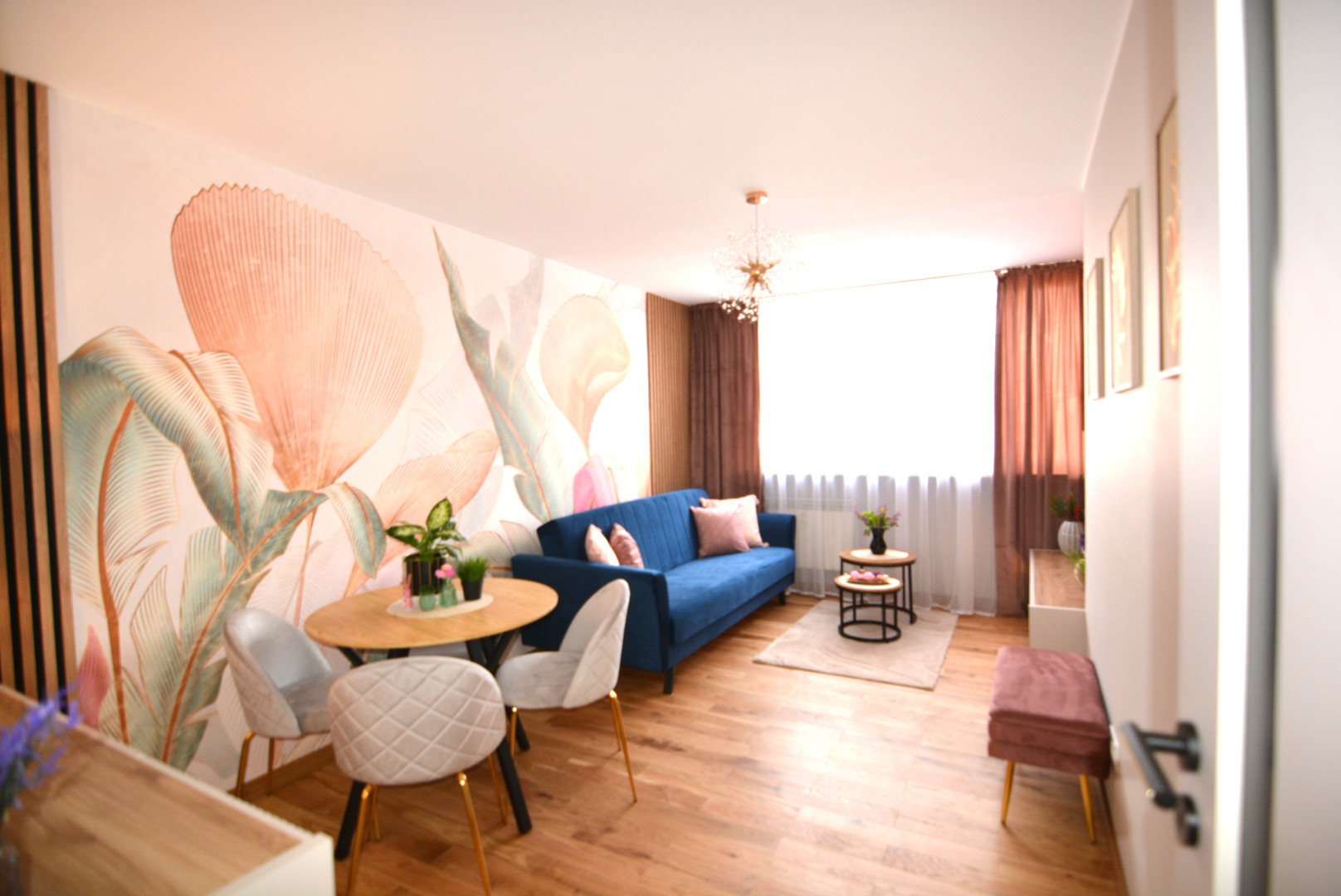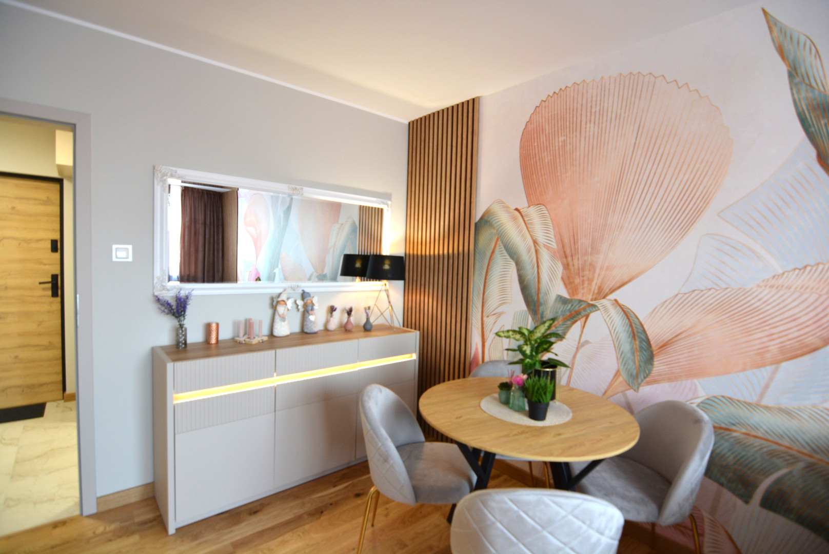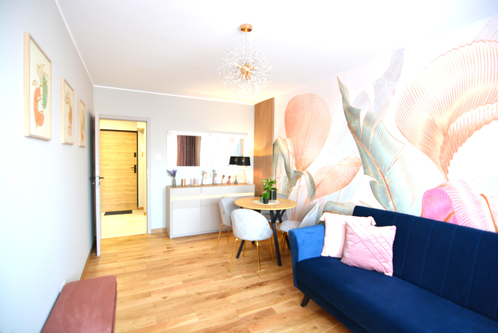 -salon wyposażony w kanapę z funkcją spania, stół z czterema krzesłami, szafkę rtv, telewizor, komodę, lustro, stoliki kawowe i pufę