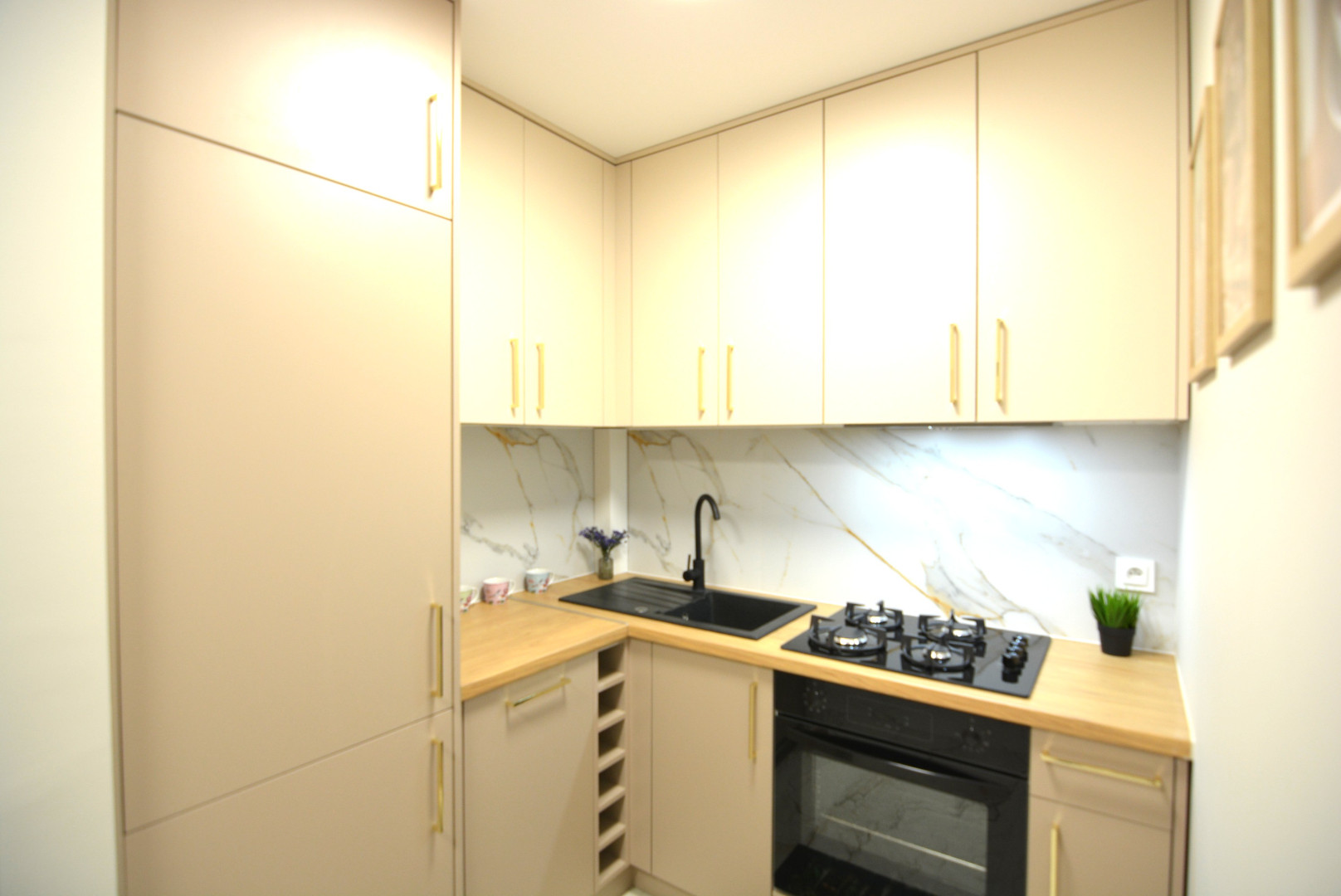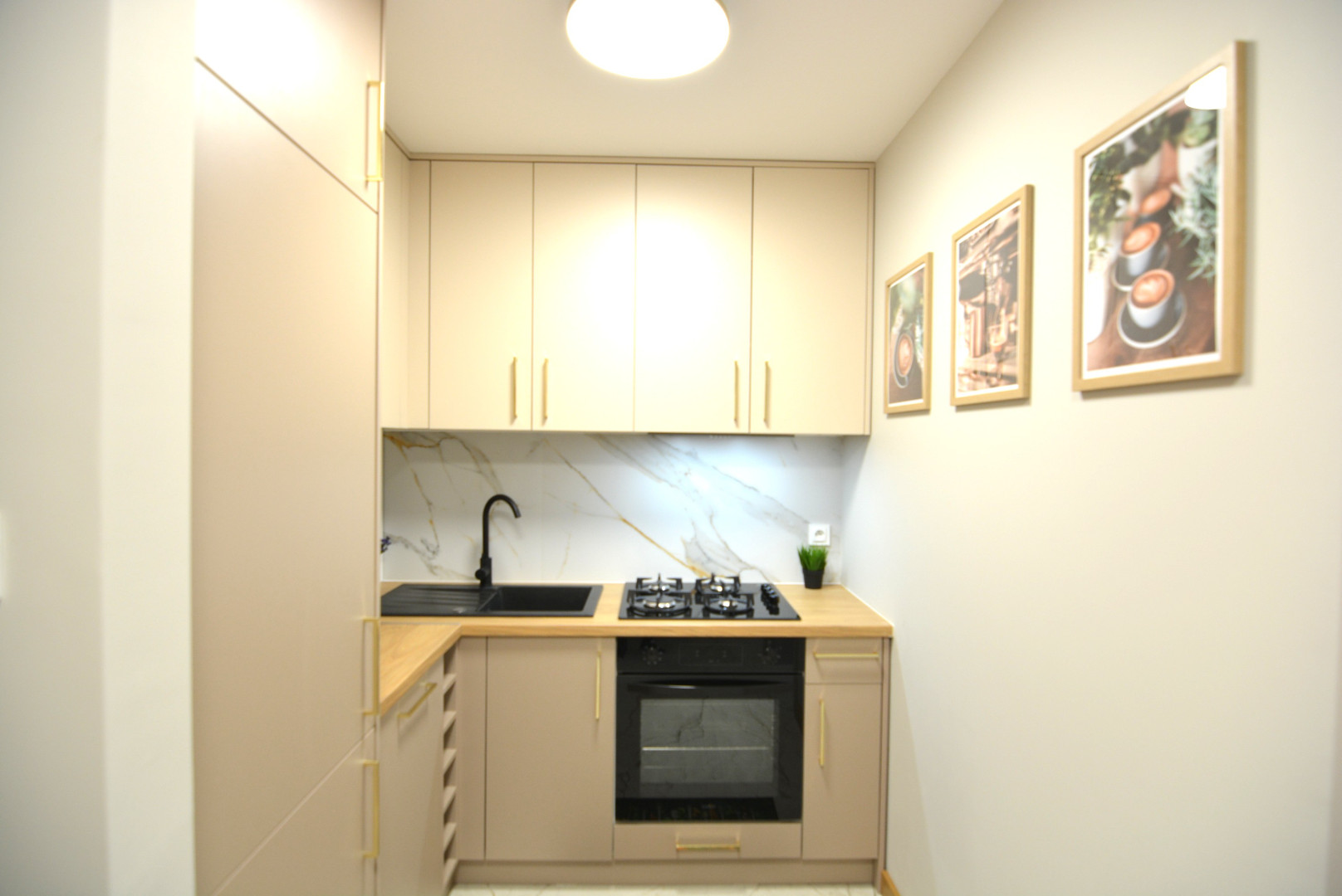 -kuchnia z zabudową meblową i sprzętem agd tj. lodówką, zmywarką, piekarnikiem, płytą gazową i okapem