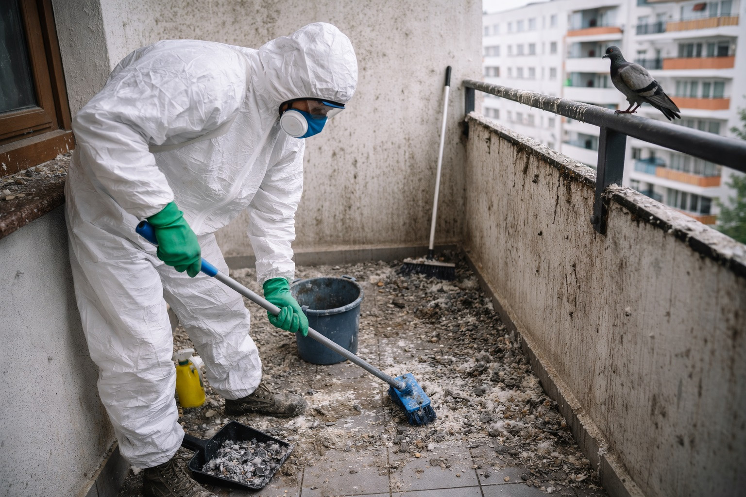 • Kompleksowe porządkowanie balkonów, loggii, dachów, poddaszy, hal i innych przestrzeni zabrudzonych przez gołębie.