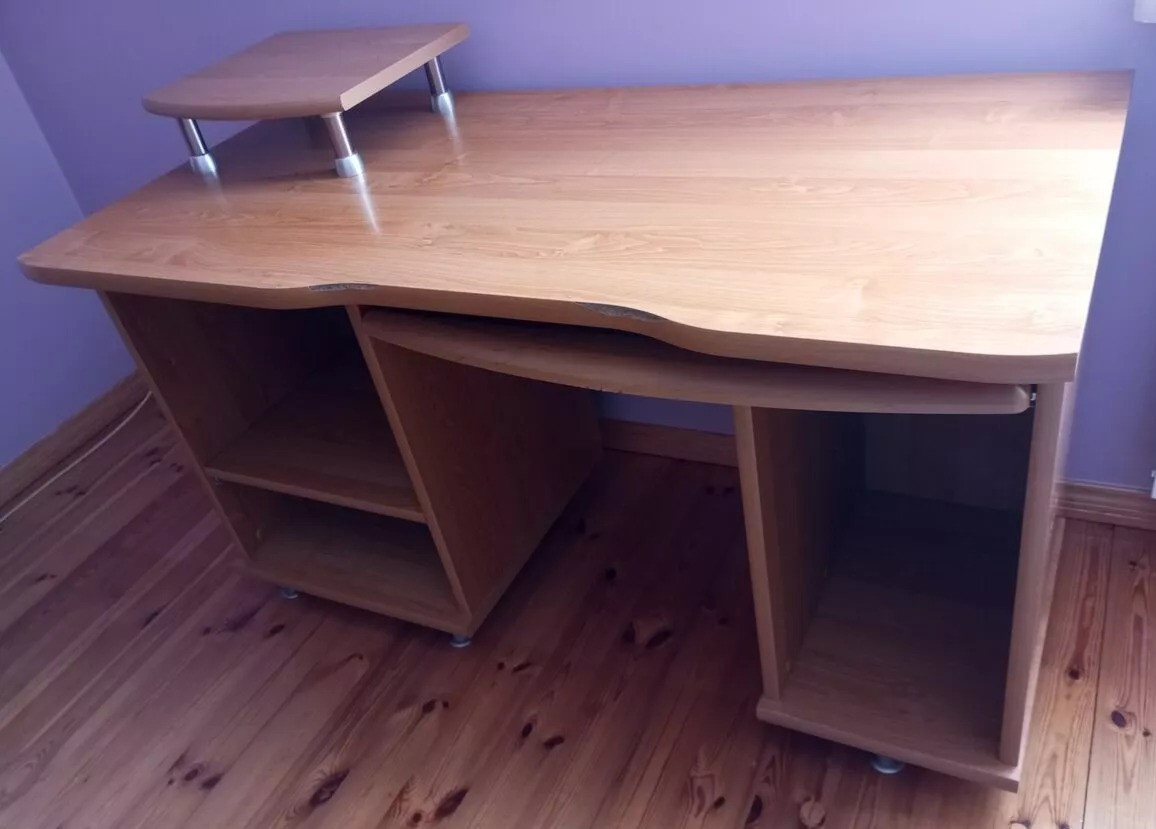 Duże, masywne biurko komputerowe w dobrym stanie. Wykonane z drewna, posiada wysuwane półki na klawiaturę oraz drukarkę. Posiada również nadstawkę jak na zdjęciu. Idealne do pracy w domu lub biurze. Praktyczne i funkcjonalne rozwiązanie.